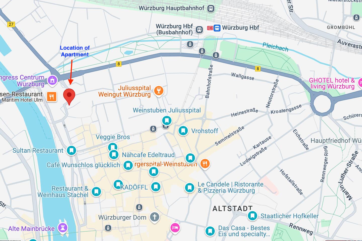 The accommodation is in a very central location in Würzburg. Opposite the building is the congress center, the city center can be reached in a few minutes on foot. There are restaurants and bars in the direct neighborhood.