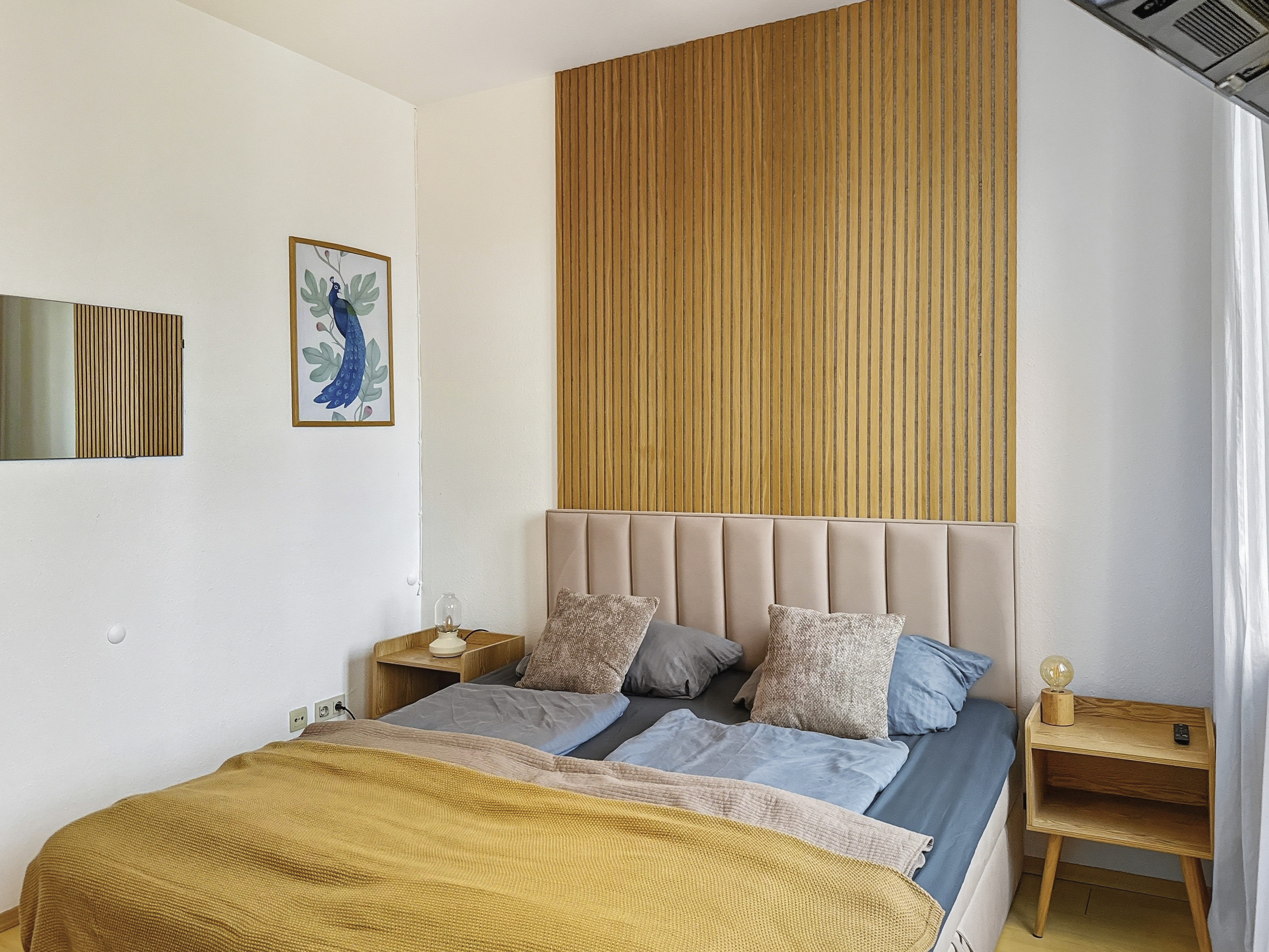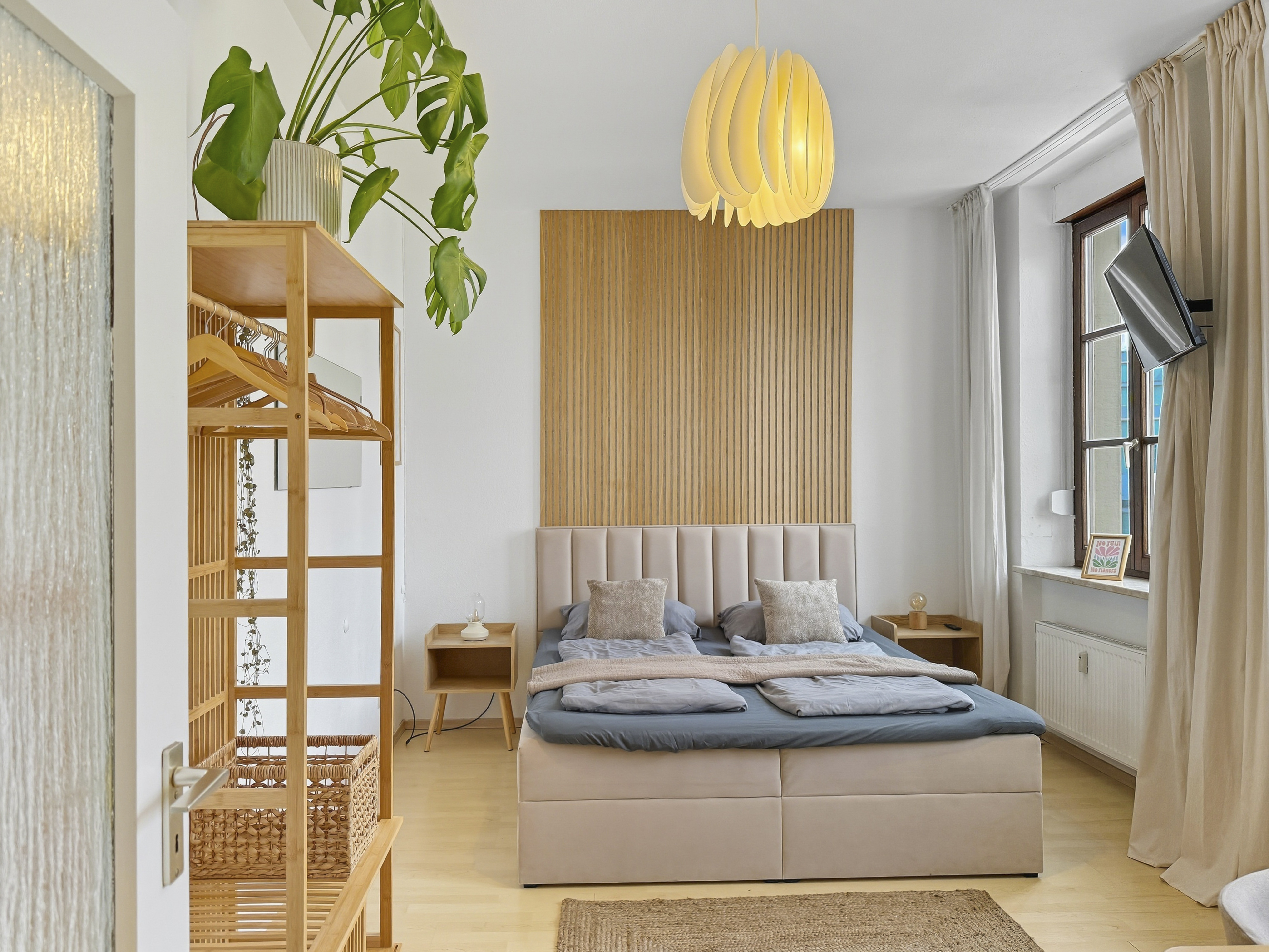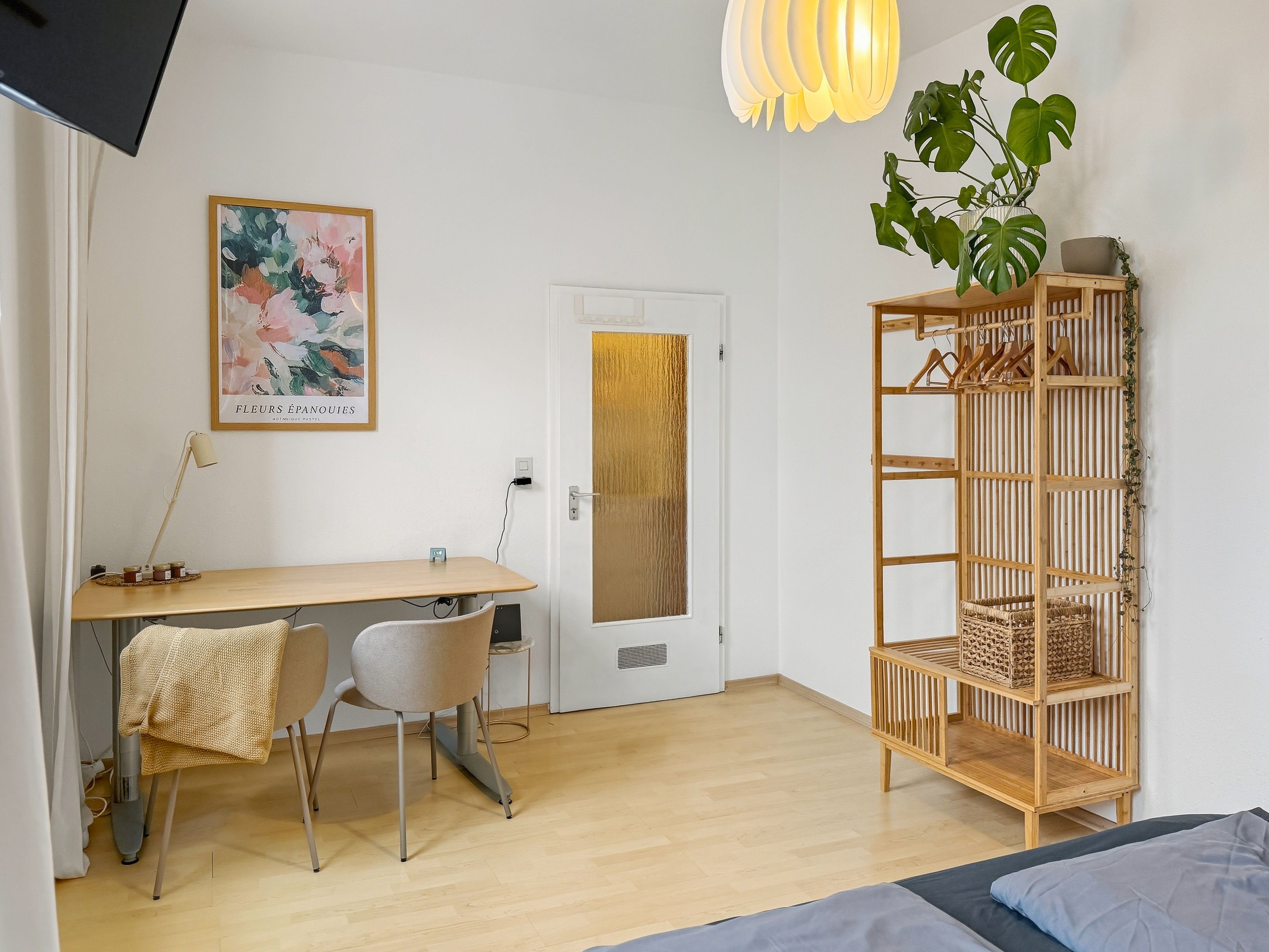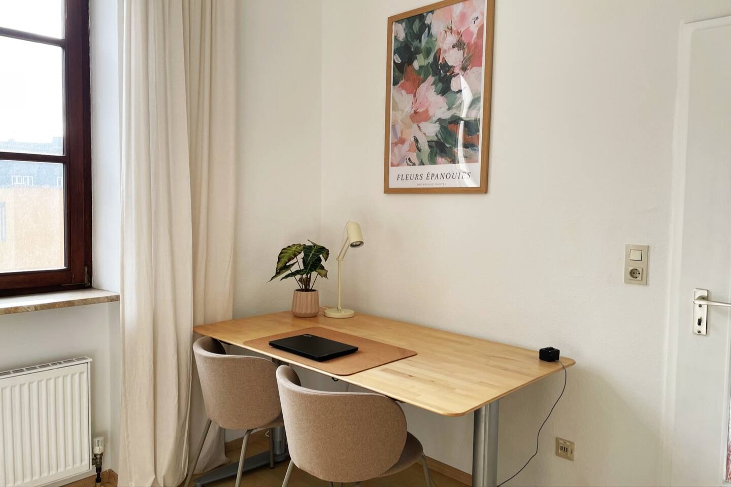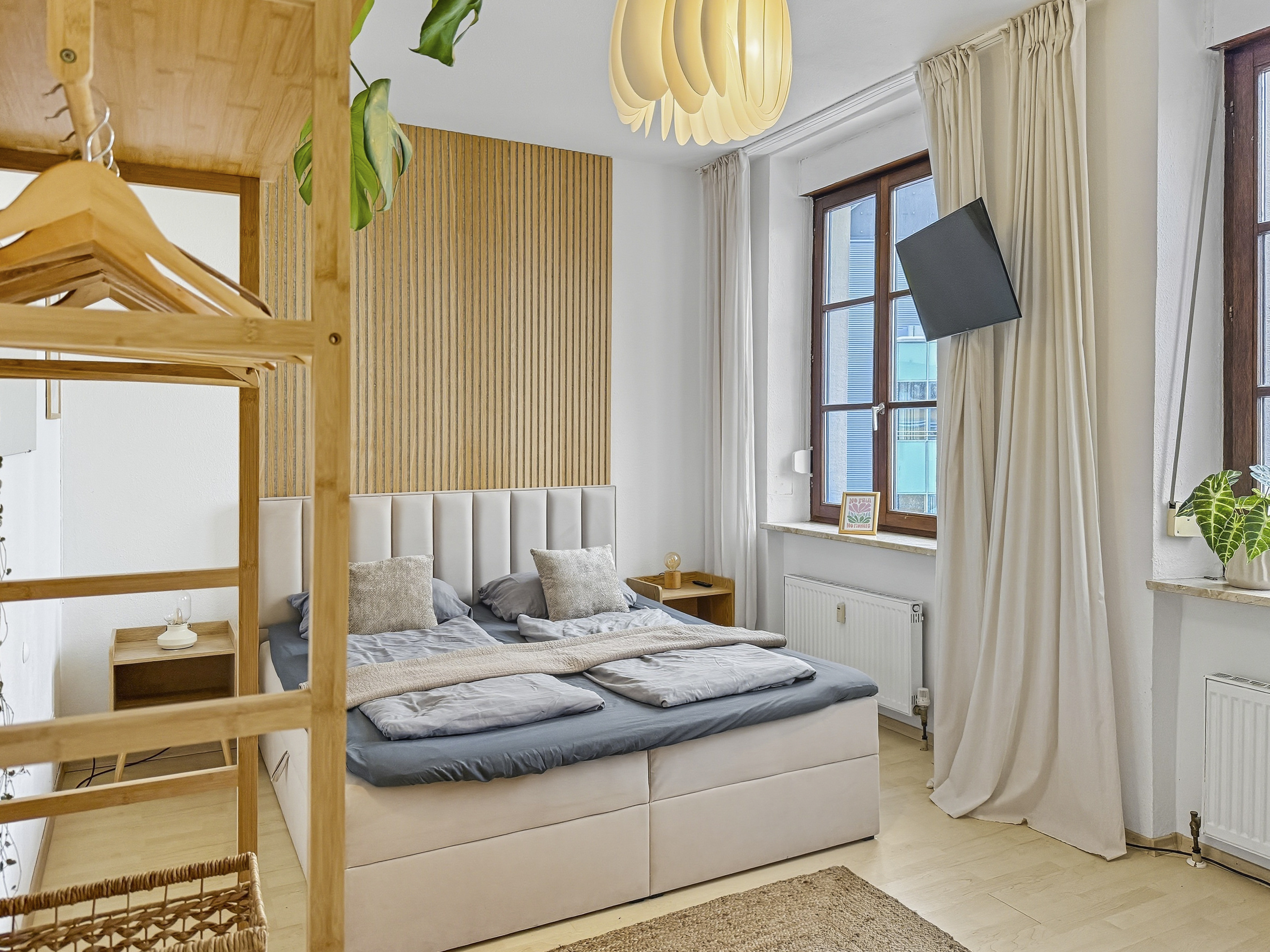 Excellent location for city trips! Cozy studio in a classic old building; approx. 22 m²; 2nd floor without elevator, located directly across from the Congress Center. -180x200 box-spring bed -Desk/dining table -Fully equipped kitchenette -Bathroom with shower -Washing machine available in the building Flexible self check-in with key box >1 min to the Congress Center >3 min to the Main riverside promenade >12 min to the main train station >5 min to the city center