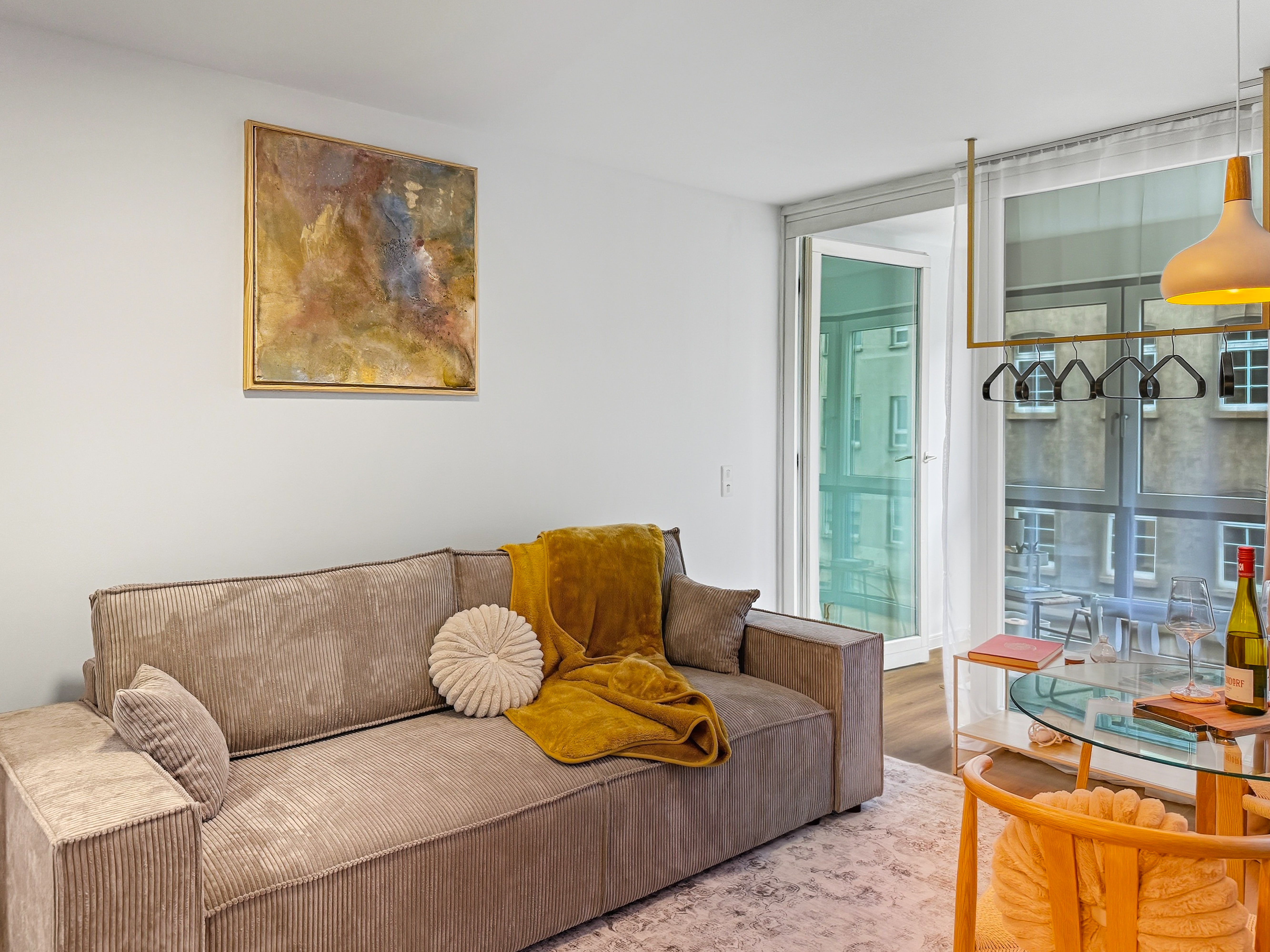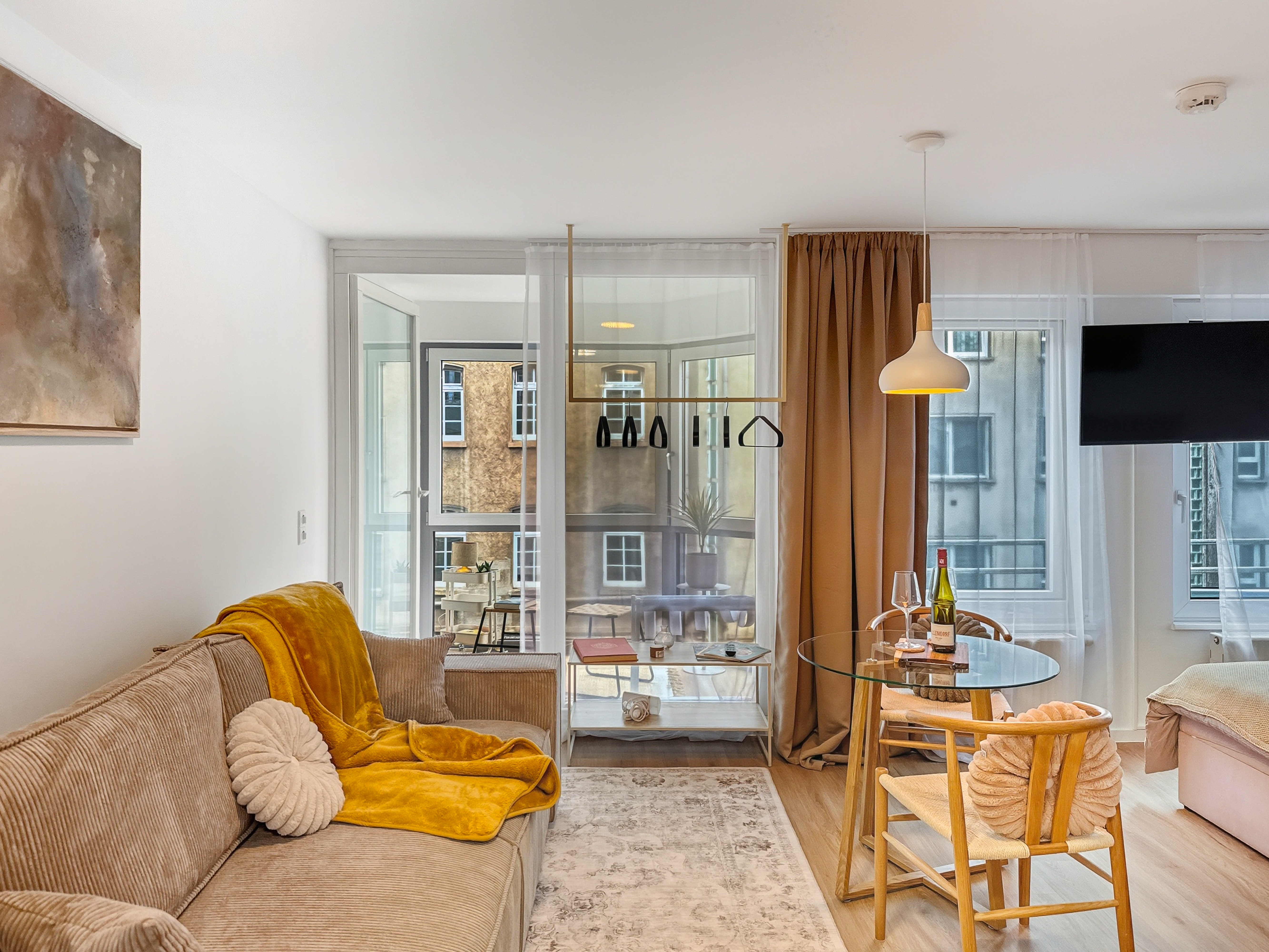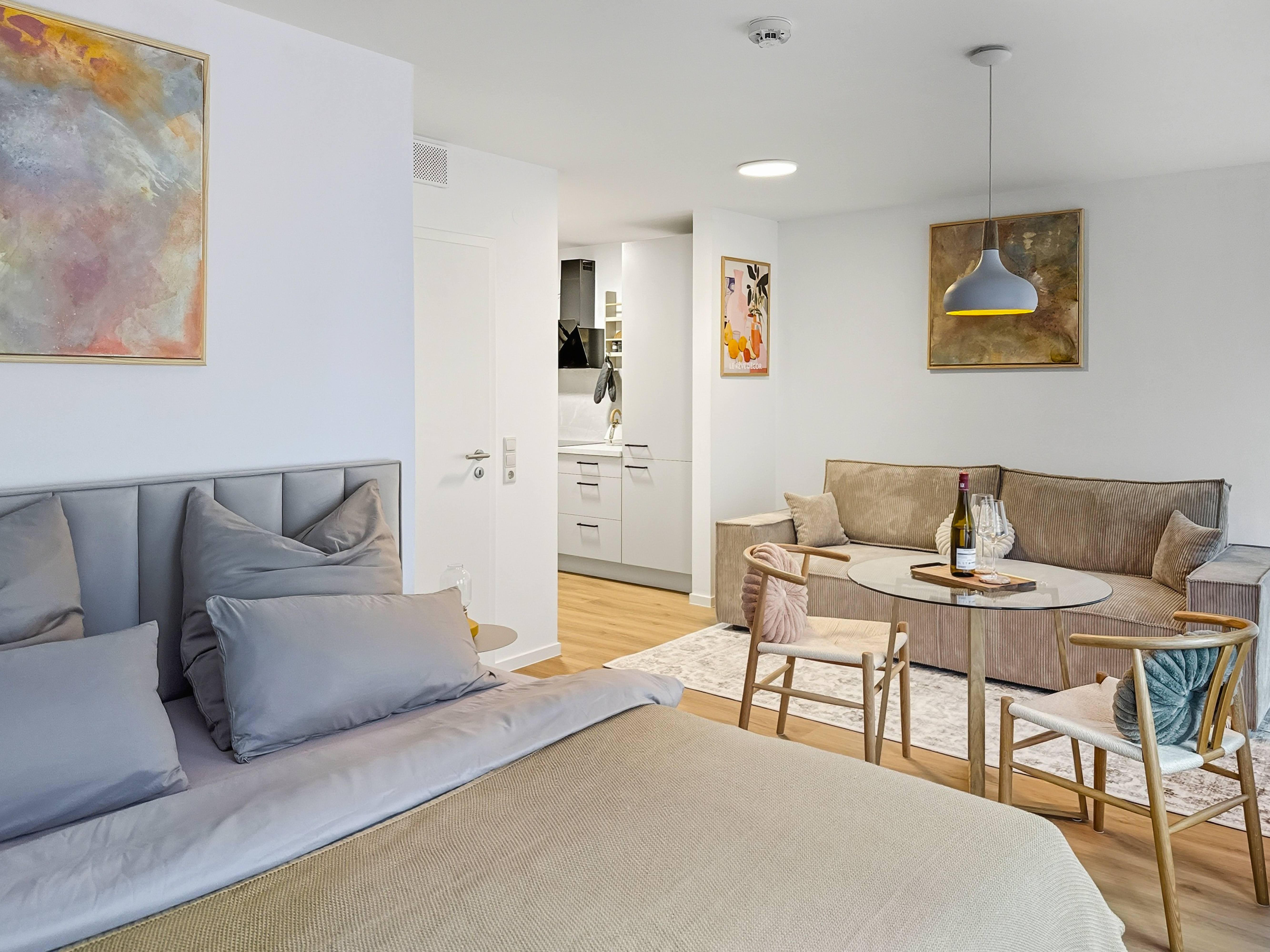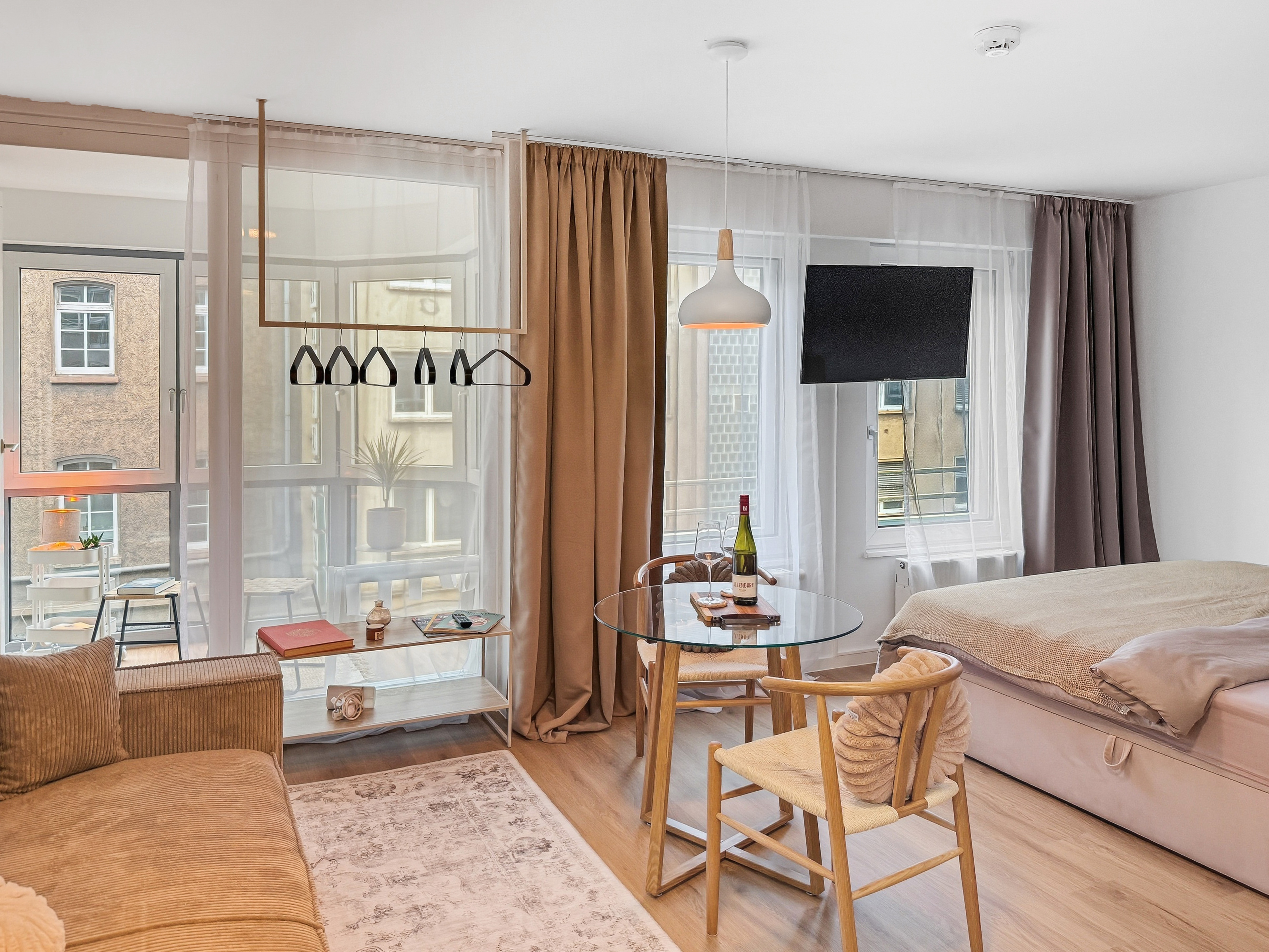 Willkommen in diesem modern eingerichteten Studio-Apartment in Würzburg-Grombühl. Die Wohnung ist hell, funktional und gemütlich zugleich – mit einem offenen Wohnbereich, voll ausgestatteter Küche, Essplatz und einem komfortablen Schlafbereich. Ideal zum Abschalten nach einem Klinik-/Uni-Tag, einem Business-Termin oder einer Tour durch Innenstadt und Weinberge. Dank der zweifachen Verglasung bleibt es innen angenehm ruhig. Der digitale Self-Check-in macht die Anreise flexibel, und der kostenlose Tiefgaragenstellplatz sorgt für entspanntes Parken – inklusive Aufzug direkt bis zur Wohnung. ★ WOHN- & ESSBEREICH ★ Lehn dich zurück, genieße den Smart-TV oder plane den nächsten Tag bei einem Glas Wein am Esstisch. ✔ Gemütliches Schlafsofa (als Schlafplatz nutzbar) ✔ Smart-TV ✔ Esstisch mit Sitzplätzen ✔ Helle, moderne Atmosphäre ★ KÜCHE ★ Die Küche ist komplett ausgestattet – perfekt für Frühstück, Home-Office-Lunch oder ein richtiges Abendessen. ✔ 4 Kochfelder ✔ Backofen ✔ Spülmaschine ✔ Nespresso-Kaffeemaschine ✔ Wasserkocher ✔ Kühl-/Gefrierkombination ✔ Töpfe, Pfannen, Geschirr & Besteck ✔ Gläser & Weingläser ★ SCHLAFEN – BETT + SOFA ★ Nach einem langen Tag wartet ein hochwertiges Kingsize-Bett auf dich – und bei Bedarf bietet das Sofa zusätzlichen Schlafplatz. ✔ Kingsize-Bett (180 cm) ✔ Frische Bettwäsche & Kissen ✔ Stauraum & Kleiderbügel ✔ Verdunkelungsmöglichkeit (je nach Bereich) ★ BAD ★ Das Badezimmer ist praktisch und komfortabel – mit Badewanne und Waschmaschine für längere Aufenthalte. ✔ Badewanne ✔ Waschmaschine ✔ Handtücher ✔ Föhn ✔ Spiegel & Waschbecken ✔ WC ✔ Basis-Toilettenartikel ★ PARKEN & ANREISE ★ Stressfrei ankommen – auch mit Gepäck. ✔ Kostenloser Tiefgaragenstellplatz Nr. 77 (Ebene -2) ✔ Aufzug von der Tiefgarage direkt bis zur Wohnung ✔ Zusätzliche Parkmöglichkeit auf Ebene -1 (öffentlich) ✔ Einfahrtshöhe Tiefgarage: max. 2,0 m ✔ Digitaler Self-Check-in (Link & Code) Wenn Fragen auftauchen, einfach kurz melden – wir helfen schnell weiter und möchten, dass der Aufenthalt unkompliziert und angenehm wird.
